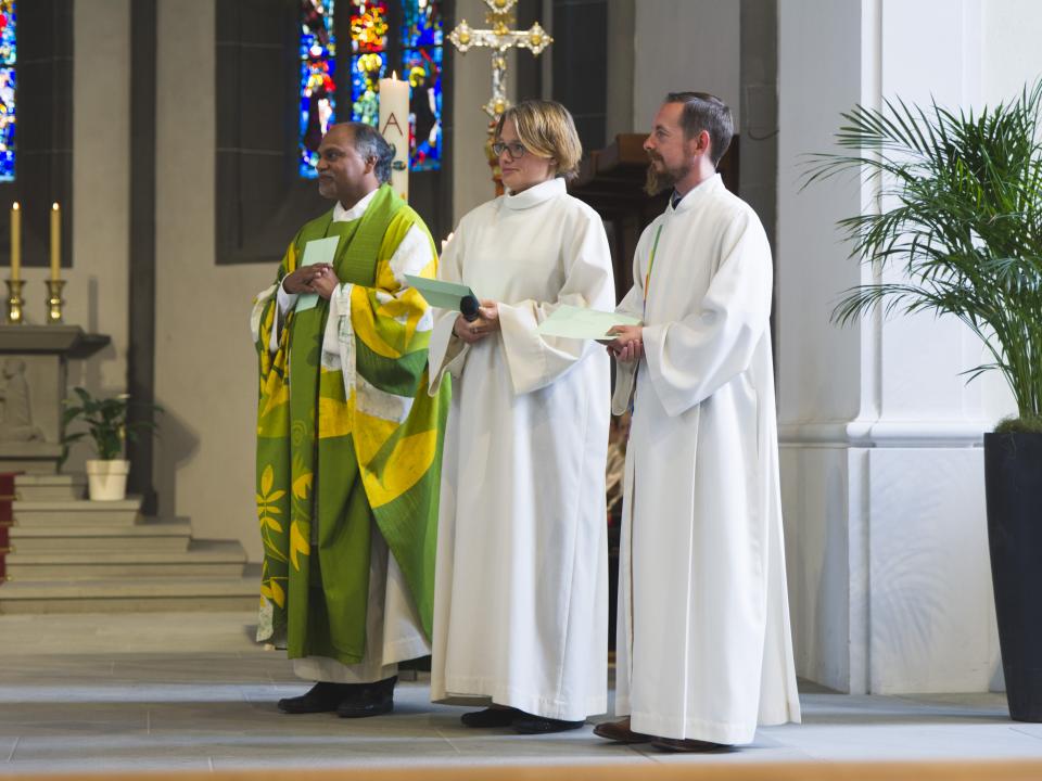 Margrith Mühlebach dankt für die Bereitschaft und übergibt im Auftrag von Bischof Felix Gmür die Missio an Simone und Tobias Zierof als Gemeindeleiter ad Interim und an Joseph Devasia als mitarbeitenden Priester mit Pfarrverantwortung. Margrith Mühlebach beendet die Einsetzungszeremonie mit den Worten: „.. Seid ihr bereit?“ und die Antwort lautet einstimmig: „Wir sind bereit“.