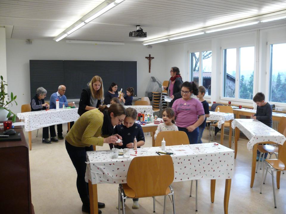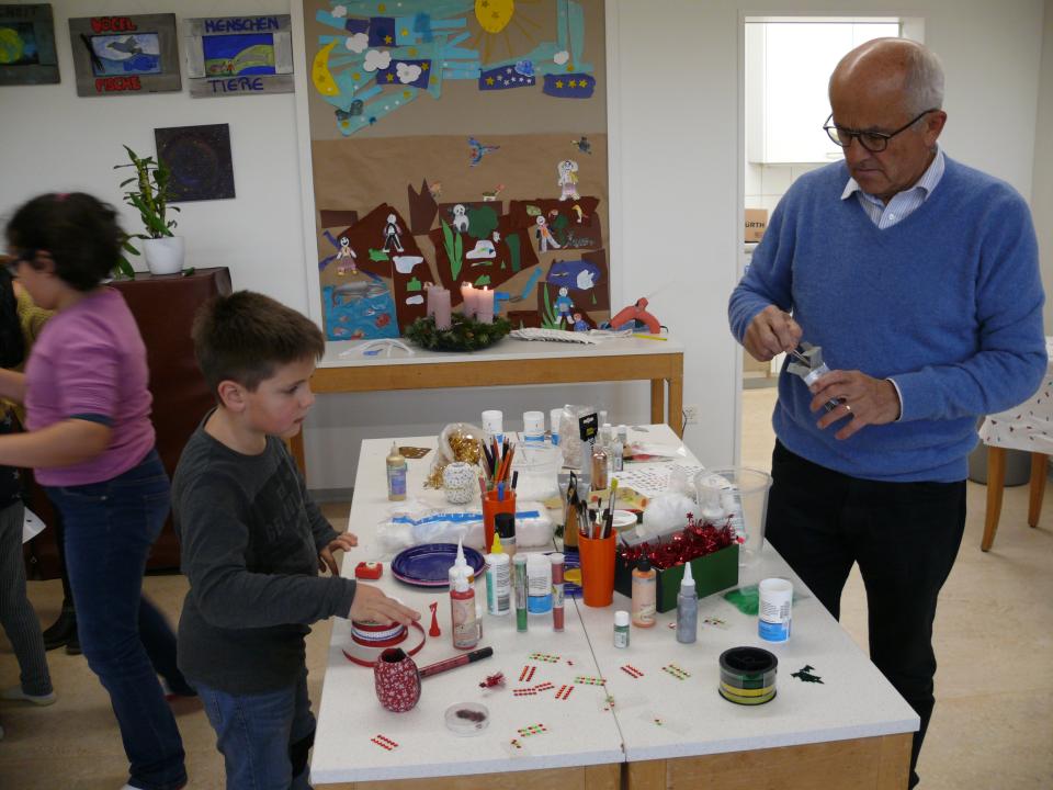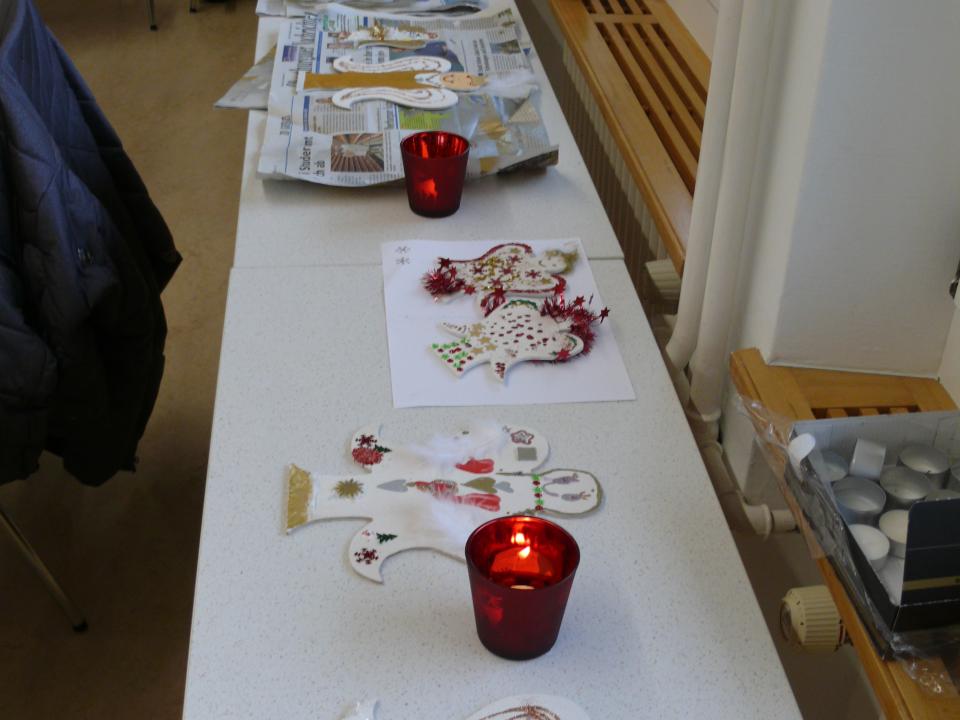 Rund um einen Materialtisch entstanden die verschiedensten Engel aus Glitzer, Federn, Girlanden, Strasssteinchen, Gold und Silber. Der Phantasie waren keine Grenzen gesetzt und alle genossen die gemütliche Bastelstubenathmosphäre im KGH Steinebrunn.
